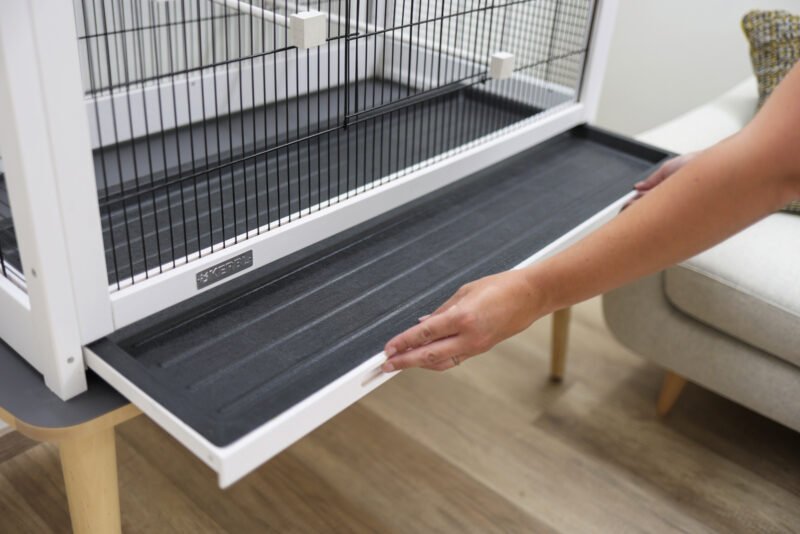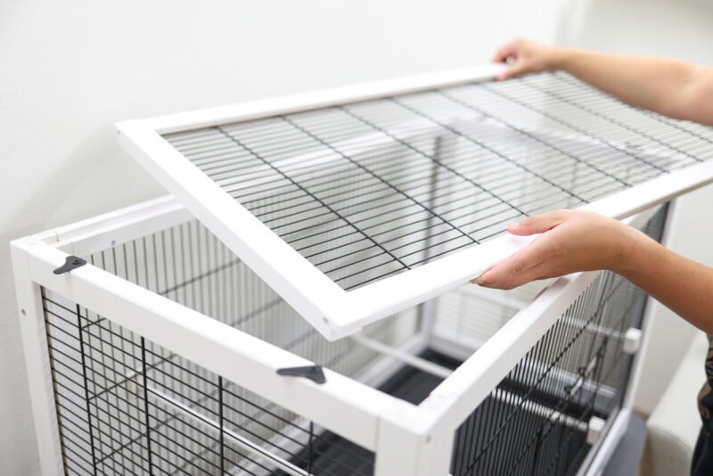 Solid Wood Body, pull-out plastic tray makes cleaning easier, grille bars: round, black, removable roof, side opening: 10 x 13 cm (e.g. for water bath), front opening: 20 x 23 cm