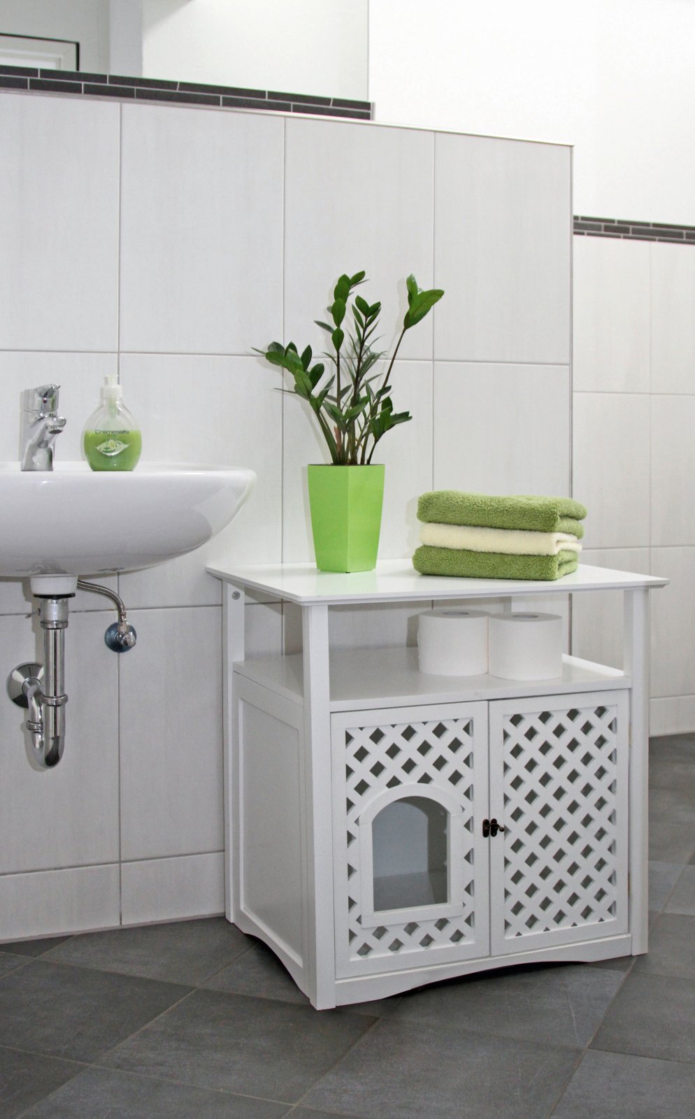 multi-functional cat furniture, can be used as a litter tray house or as a cat cave, bed cushion or toilet can be integrated, doors fitted with magnetic catches and can also be fixed in place, entry height: 9 cm, matching cat toilet 84227