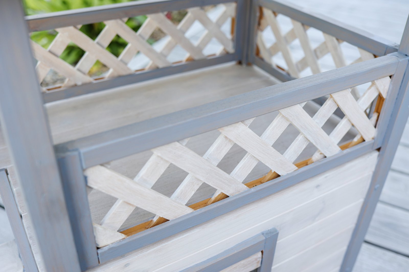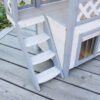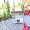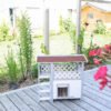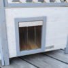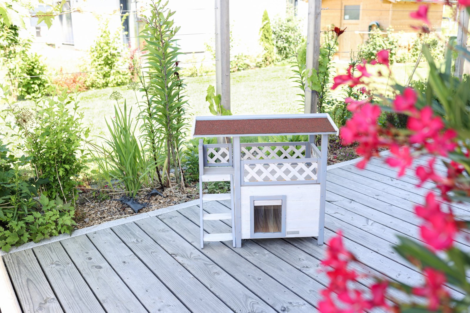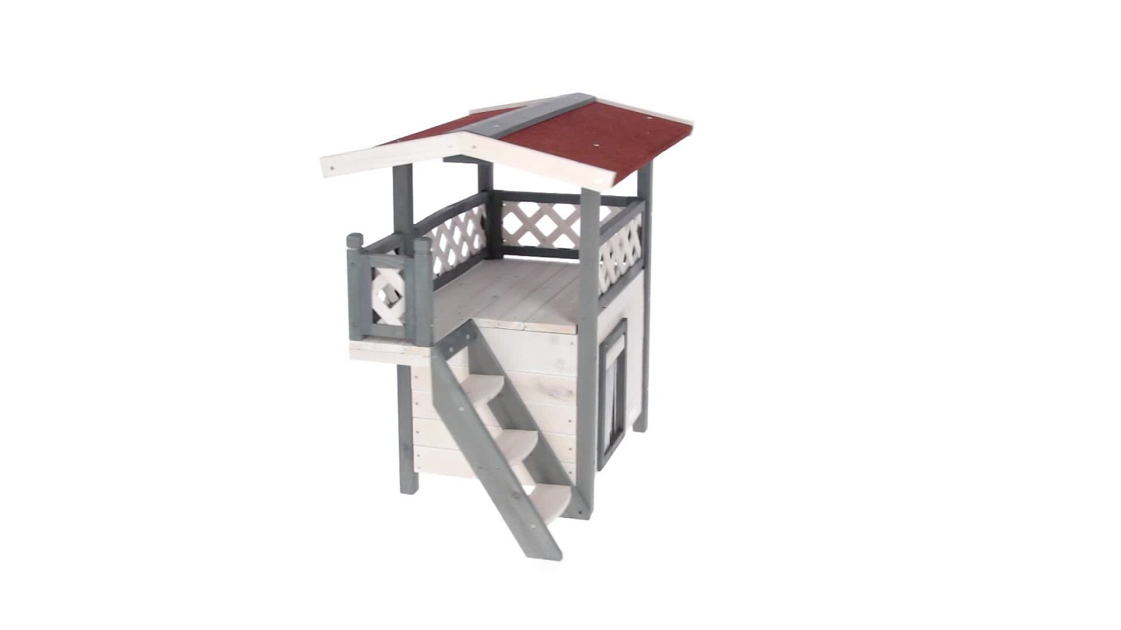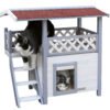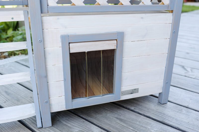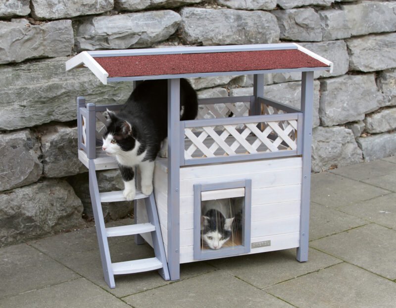 Weatherproof and comfortable: the cat house is equipped with a weatherproof bitumen roof that offers excellent protection from rain and direct sunlight. This makes it the perfect outdoor cat house for your garden to offer your outdoor cats a safe retreat., Safe and protected: a swing door with a transparent flap protects your beloved four-legged friends from the wind and cold. This detail ensures that the outdoor cat house is a safe and warm place for your cats during the cold months., Robust and long-lasting: made from spruce and varnished with wood protection paint, the cat house is a robust and durable shelter. The materials used ensure that the product has a long service life and that your cat will enjoy it for many years to come., Easy assembly: the outdoor cat house is quick and easy to assemble. Clear and detailed assembly instructions are included so that even less experienced cat owners can assemble the house without any problems., Spacious and versatile: with an indoor area, staircase and spacious veranda, the two-storey cat house offers plenty of space and comfort for your cat. The interior dimensions of the cottage and the lying area of the veranda are generously proportioned, making Lodge Ontario a true cat villa.