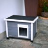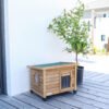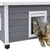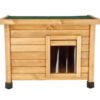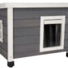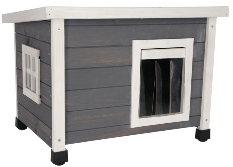 A protected place in the open air: The solid wood Rustica cat house provides your outdoor cats with a dry, protected location at all times. The Plexiglas windows ensure sufficient light inside., Wind and weather-resistant: Thanks to the robust wooden structure made from high-quality split pine, wind and weather cannot affect your cats or the house. The swing door with strip curtain also provides protection from draughts and cold., Stable and safe: The height-adjustable plastic feet allow a safe and stable position anywhere., Sufficient space for two cats: The cat house even has enough space for two cats, or instead it can also be equipped with food and water., Delivery and installation: The house is delivered in a dismantled state. A screwdriver is required for assembly, and only a few actions are required.