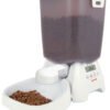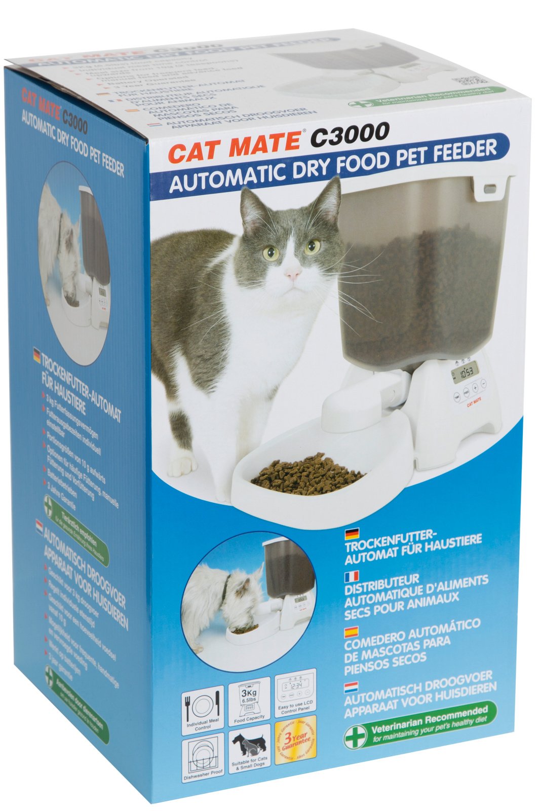 easy-to-use programmable LCD controller, battery life with constant use 6 to 9 months, pet-safe clip-closure cover, unique feeding mechanism ensures precise constant portion size, from 10 g upwards, bowls, feed containers, covers, outlet openings and feed screw conveyors are easy to clean and are dishwasher-safe, suitable for cats and small dogs, feed containers for up to 3 kg filling weight (enough for one cat for approx. 1 month)